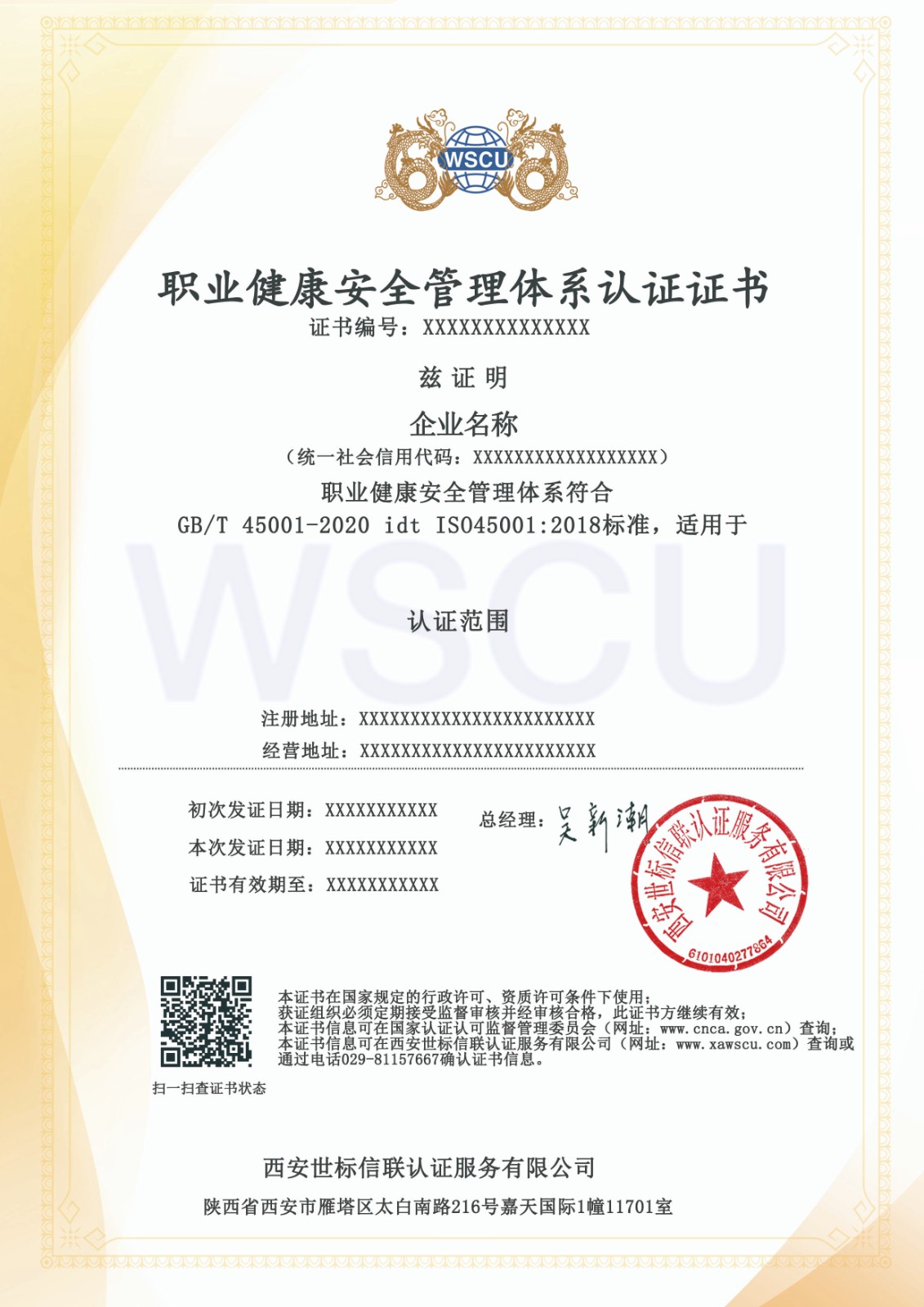 4、职业健康安全管理体系认证证书样式